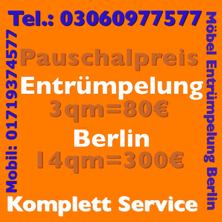 Ebenso wird eine BSR Entsorgung in privat 03060977577 schnell einmal notwendig. Mit uns als Partner lässt sie dies auch ohne langfristige Planung schnell komfortabel realisieren. Mit unseren Wohnungsauflösung Angeboten Entrümpelungsdienst Sperrmüllabholung privat, Möbel Entsorgung privat 03060977577 und auf Video Entsorgung und Bilder von Entsorgung Sperrmüll privat, erhalten Sie Ihre Emtrümpelung fachmännisch zum vereinbarten Preis. Wohnung Entsorgung in privat 03060977577 oder Möbel Entsorgung in privat 03060977577 werden jeweils im Rahmen unseres Abtransport-Sofortdienstes mit einem modernen Sprinter Fahrzeug durchgeführt und damit zu einem komfortablen Vorhaben zum exklusiven Hammerpreis. Bei uns stimmen Angebot, Preis, Leistung, Service. Überzeugen Sie sich und rufen Sie uns an. Unser professionelle Wohnungsentrümpelung privat Service ist jederzeit erreichbar und steht zu Ihrem Wunschtermin für alle Arbeiten rund um Entsorgung inkl. Abholung in privat 03060977577 zur Verfügung.